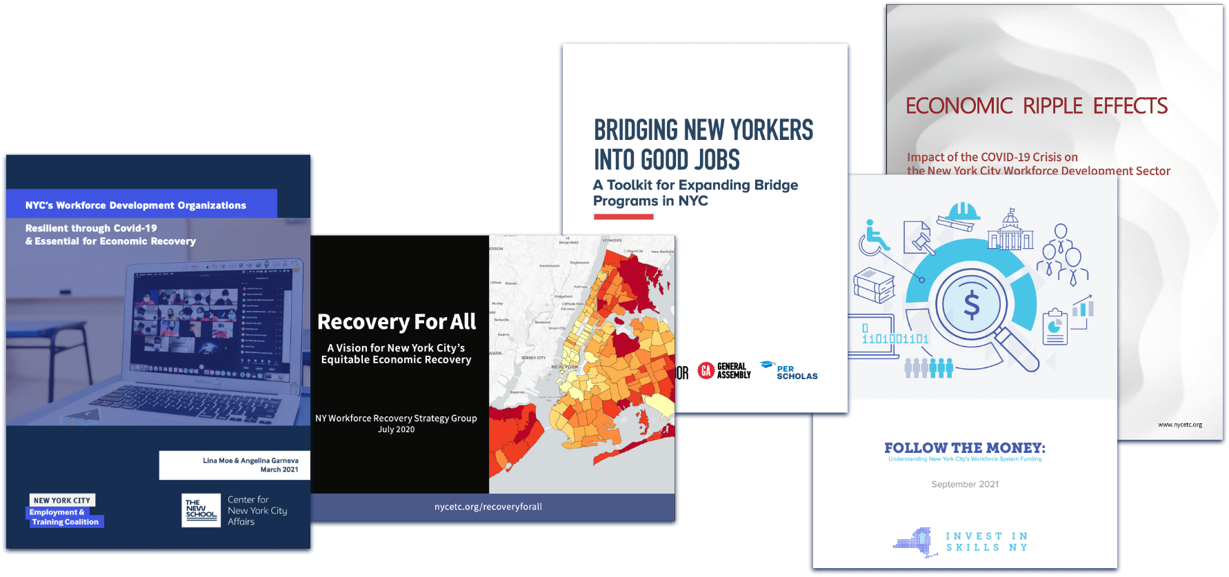 Recovery For All: A Vision for New York City’s Equitable Economic Recovery (2020)As an immediate response to the pandemic and subsequent recession, we formed the NY Workforce Recovery Strategy Group. Composed of over 80 leaders from the private and human services sectors, the group developed a recovery plan centered on small businesses and workforce development for displaced workers and marginalized communities. The final plan informed our recovery strategy in 2021 and engagement with current City, State and Federal leadership and candidates for office.